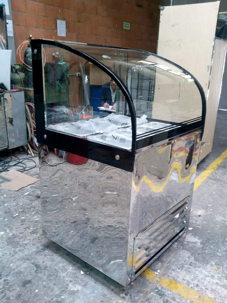 • Dimensiones: Alto total a zona de trabajo 90 cm (la altura del vidrio curvo es adicional) y ancho o profundidad total de 75 cm.