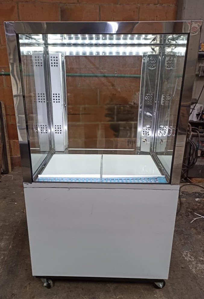 - Vitrina refrigerada elaborada en acero inoxidable brillante o satinado.